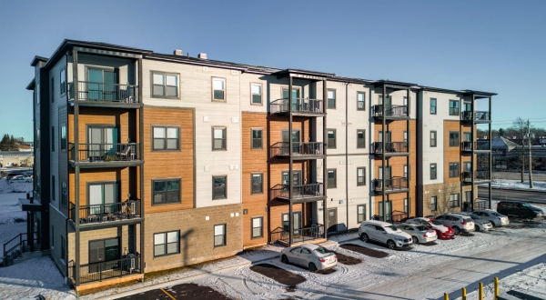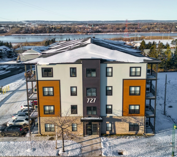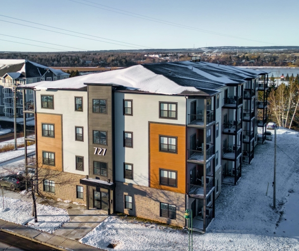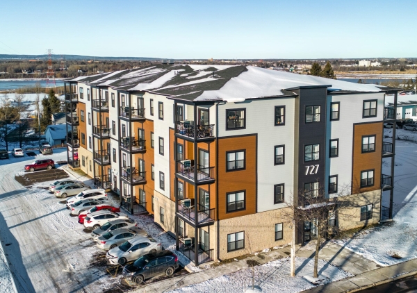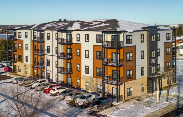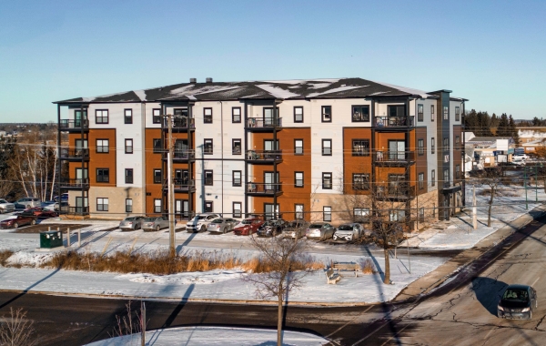 Apartment complex constructed using prefabricated wood panel and joist systems. This 4-storey building has 32 residential units.