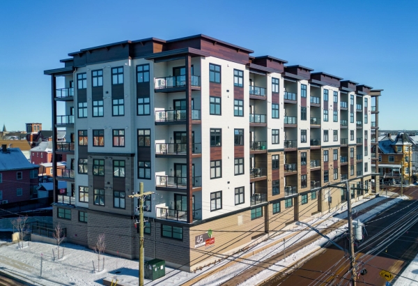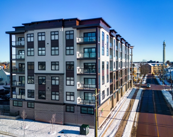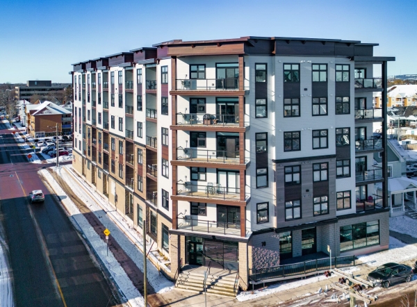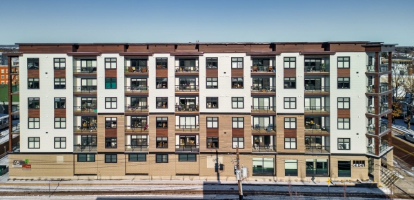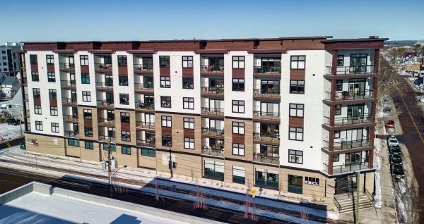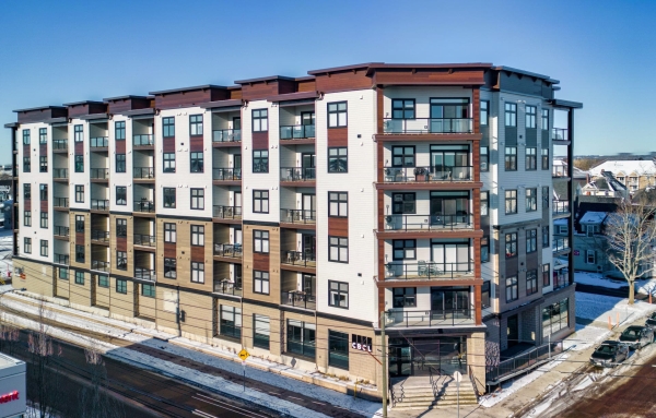 Mixed-use apartment complex constructed using prefabricated wood panel and joist systems. This building is 6-storeys above grade with 1 level of underground parking and includes commercial space and parking on the main level. There is a total of 65 residential units.