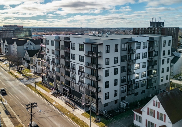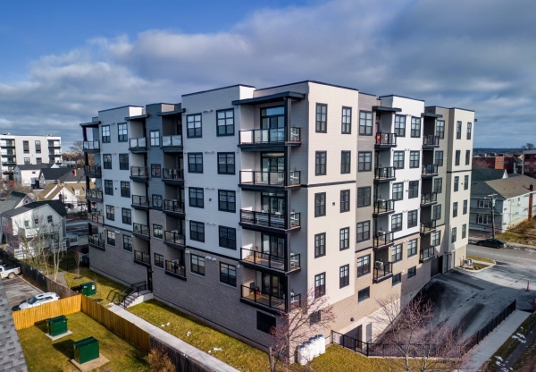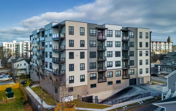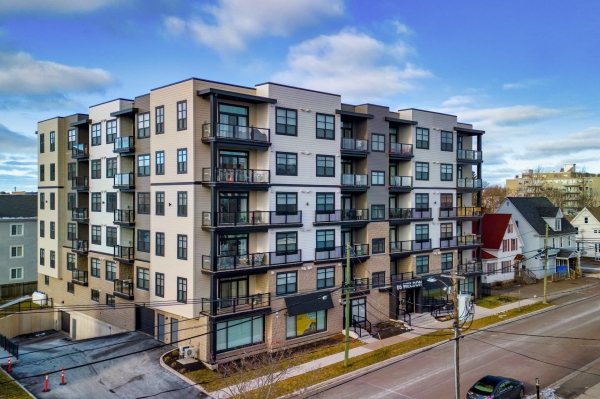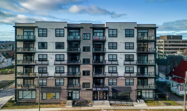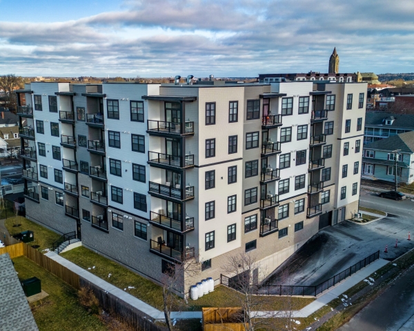 Apartment complex constructed using prefabricated wood panel and joist systems. This building is 6-storey above grade with 1 level of underground parking and includes amenity space and parking on the main level. There is a total of 67 residential units.